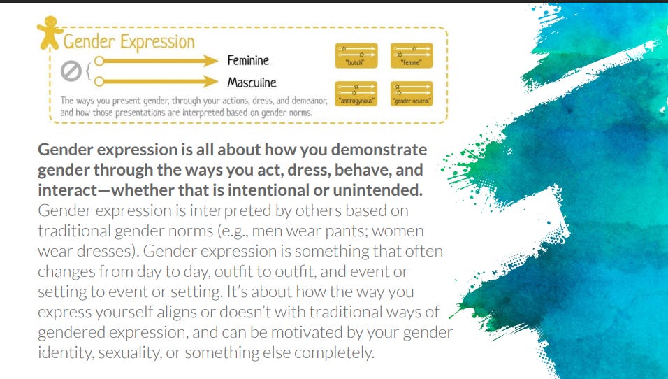 If you’re a girl who wants to be a CEO, don’t want to wear pink and want to play with the boys, it’s not entirely reasonable, it’s because your gender identity is not aligned with your sex! If you’re a boy uncomfortable with masculinity or male stereotypes, you might not be a real boy! Luckily, the resources say, if you don’t like social expectations around your sex, you can go and talk to Rainbow Youth.