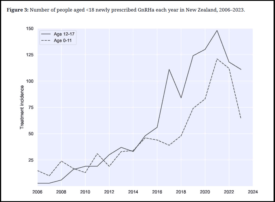 We see the phenomenon in the statistics. In the 2021/2022 Growing up in New Zealand study, 8.2% of girls and 1.5% of boys reported non-binary or transgender identification. New Zealand prescriptions for puberty blockers for 12-17 year olds rose slowly from 2008 and then rapidly from 2016 until 20211. Blocking puberty is no minor intervention. When used for gender dysphoria, puberty blockers disrupt the healthy endocrine systems of our rangatahi. They stop the release of hormones associated with physical, emotional and cognitive development. Parents and kids have been told they are lifesaving, reversible and safe but there’s no evidence for that.