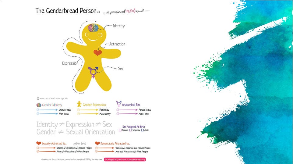Some of the information is visual and not able to fit into the table but is still worth sharing. Here’s the Genderbread person from the Example Workbook.