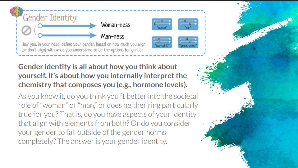 Since 2015, coinciding with that rapid rise in puberty blocker prescription and the increase in non-binary and trans identification, school resources have been teaching kids gender ideology. That’s the suite of beliefs that says everyone has a gender identity, gender identity is more important than biological sex, gender identity and sex exist on a continuum, defending sex-based rights is bigoted, and women can have penises. Gender ideology is not taught as a set of beliefs, it’s taught as fact.